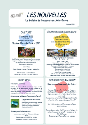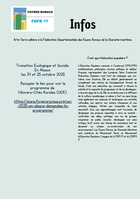 L'association Arts-Terre créé en 2007 est heureuse de se présenter à vous à travers ce site. L'association est adhérente à la Fédération Départementale des Foyers Ruraux de la Charente-maritime qui fédère les associations impliquées dans l'animation de nos campagnes et qui se reconnaissent dans les valeurs de l'éducation populaire.